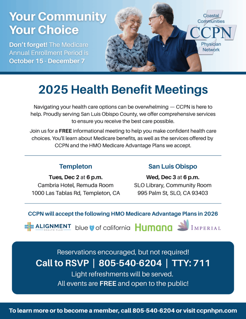 Navigating your health care options—especially Medicare—can feel overwhelming. At Coastal Communities Physician Network (CCPN), we’re here to make it easier. Proudly serving San Luis Obispo County, CCPN offers comprehensive services to help you make confident, informed decisions about your health care.