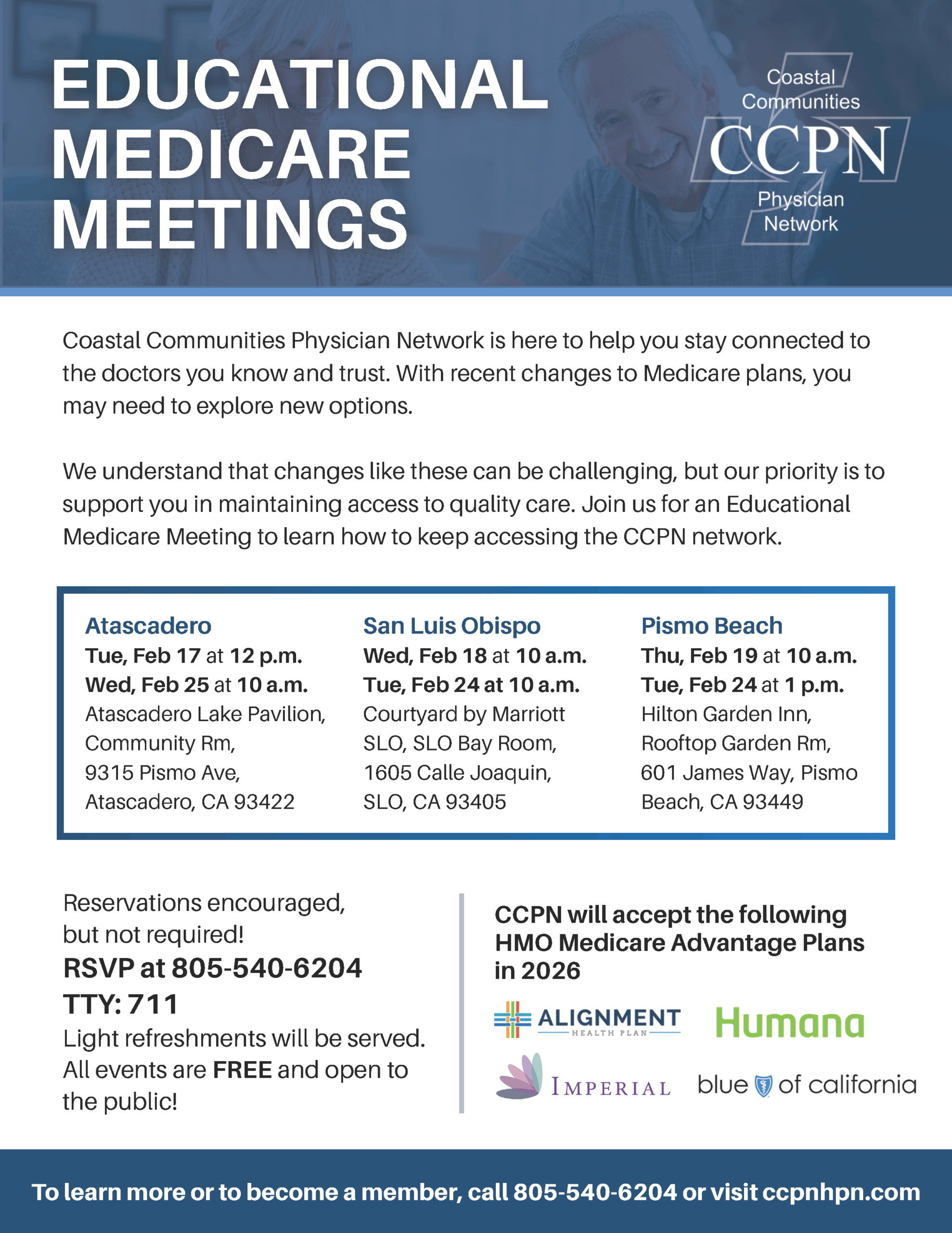 We understand that changes like these can be challenging, but our priority is to support you in maintaining access to quality care. Join us for an Educational Medicare Meeting to learn how to keep accessing the CCPN network.